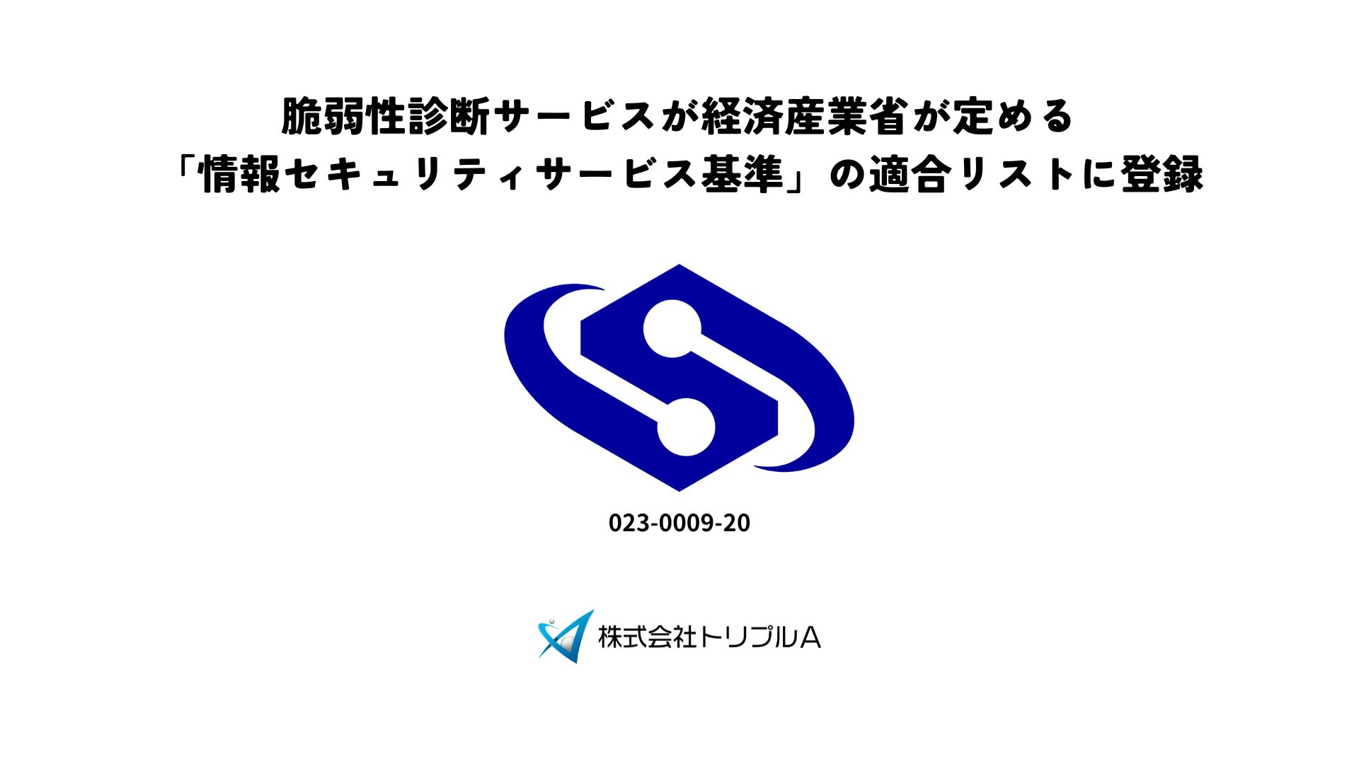 株式会社トリプルAはこの度、経済産業省の定める「情報セキュリティサービス基準※1」に適合したサービスとして、審査登録機関である特定非営利活動法人 日本セキュリティ監査協会(以下、JASA)により、「情報セキュリティサービス基準適合リスト※2」における「脆弱性診断サービス」 に登録されました。